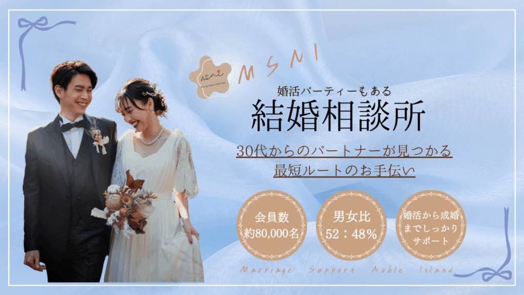 結婚はあなたの人生を左右する重要な問題です。ご自分に合ったシステムの会社を調べ、説明を聞き、納得して選ぶことをお勧めします。MNSIでは、皆様の幸せ作りのお手伝いをさせていただきますし、大阪や全国各地人気ナンバーワンのパーティ・イベントも充実しています。